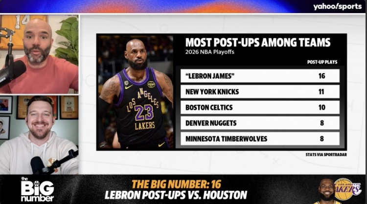 4月23日讯 据雅虎体育统计,湖人球星在对阵火箭的系列赛前两场执行背身单打的次数,已经超过了截止目前季后赛其他所有球队的背身单打次数。